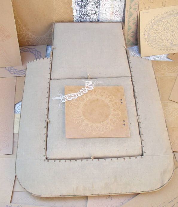 Comments: I have 92 old and new lacemaking pillows in my collection, and I’ve never seen anything like this (comments are very welcome here). Not listed in Kloppel-Kissen-Stander. Patterns appear to be French. Wrote to the seller, got an obviously “babelfished’ reply, no more useful information. I think I read the date Feb 1932 on one of the patterns, it’s hard to tell, and I don’t know if it’s significant. The construction of this pillow is quite good. Be sure to ask the seller shipping costs outside of France to avoid surprises.