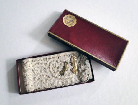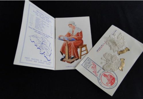 Comments: An unusual find – a Duchesse border, not particularly special, but in the original retailer’s box (Maison R. Foiret, Brussels). The advertising folder is seen occasionally on Ebay, but I’ve never seen the butterflies attached.