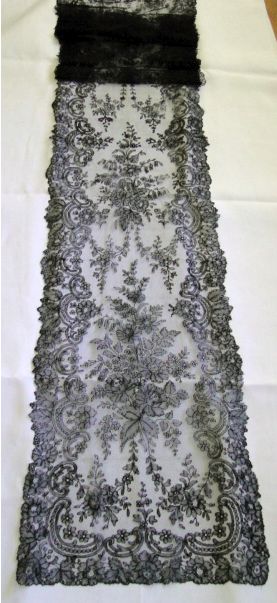 Comments: Very nice long scarf of handmade Chantilly. Can’t tell if it is French or Belgian. Nice dense typical flower design, finely worked in basically good condition.