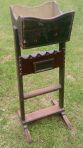 Comments: The best Erzgebirge bobbin lace stands have painted decoration, are dated or inscribed, and show wear in the right places (feet, crossbars). This one looks right, but don’t take that as proof positive. Nice three-part stand, with the top pillow basket painted with a flower design, the little covered box below, and the crossbar and feet. Children would often use the upper bar, adults the feet to steady the stand. Not adjustable, but some of the painted ones are not.