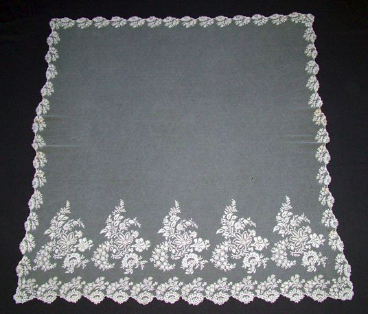 Comments: This has the typical form of a bonnet veil, but is bigger than expected. Although not a hard and fast rule, bonnet veils typically leave the edge opposite the main border undecorated. The net looks machine made, the bobbin lace motifs are really quite nice. Seem to be a few pinholes in the net, but overall good condition. A nice example.