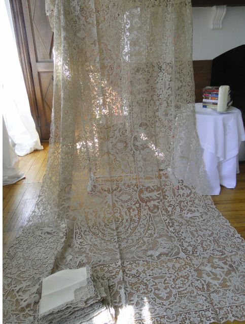 Comments: A very big tablecloth, fine condition. Pieces like this with figural work often come from Belgium, however without specific attribution, it’s difficult to tell.