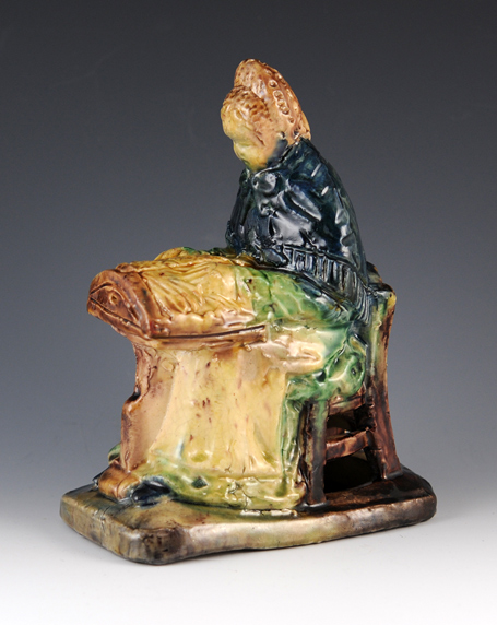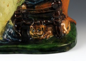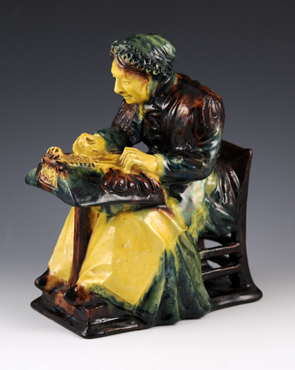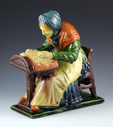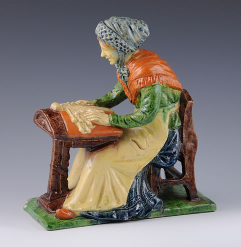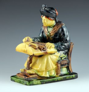 Among the better makers each piece was individually crafted, resulting in slight variations in similar pieces. Sometime the appendages and furniture were done separately and attached to a larger base – not always perfectly. The base is always hollow, with the actual figure formed from a thinner shell – a thinner piece often indicates a higher quality. Look for differences in the detail of the drapery, and in the placement of the feet around the base of the pillow stand. The best pieces have brilliant colors, good modeling around the hands and bobbins, naturally flowing drapery, and openwork in a well modeled stand and chair. Occasionally one can find a dog or cat under the chair. There is much consistency in this genre among various potters – lacemakers often have an orange shawl and blue cap. All place the pins with the right hand. Photography must also be done with care or a perspective problem develops in which the lower part of the figure seems smaller than the upper part. This normally isn’t the case in the actual figure.