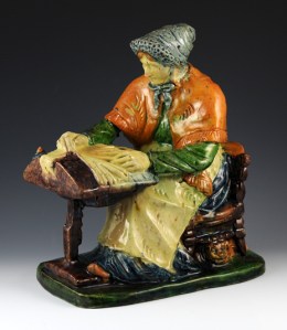 The Flemish Pottery lacemaker is very poorly documented, leading to numerous miss-attributions. Sellers often label them as ‘Majolica’, or simply admit their lack of knowledge.  Some attributed examples can be seen in a set of postcards for sale at the Kantcentrum in Bruges: Kantcentrum Postcards. The pottery is very delicate, and the figures are often chipped at the edges, or broken and repaired. The yellow flesh and orange hair takes some getting used to, but overall these figures are absolutely delightful.  Count on paying several hundred dollars for perfect examples, less than $50 for ones in poor condition.
