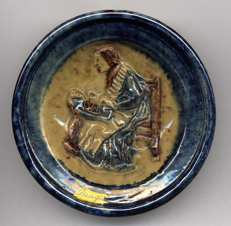 References to Flemish Pottery (information is more commonly found under “Vlaams Aardewerk” in Flemish, or “Poterie Flamande” in French) date back over a thousand years. Bruge was a major center of export. The pottery is a lead-glaze earthenware and is used for household items as well as decorative figures. Note, the lead-glaze is toxic if ingested, but an acceptable substitute that preserves the brilliant colors has not been found. Bruges is known for the ‘Flame method’ glaze, in which colors are painted onto the slip, and form ‘flames’ as they run during firing. A history of this art (in Flemish) can be found at http://www.vlaams-aardewerk-gjm.be/index.html.