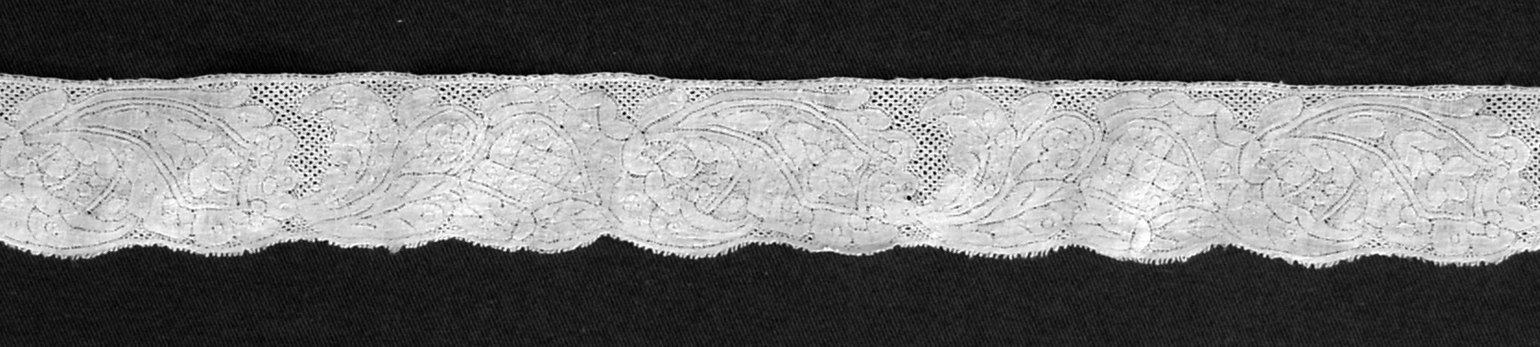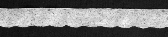 This is the first header posted for LaceNews, and represents one of my favorite laces. Unfortunately I lost my original posting on this, so am trying to recreate it for the archives. It is an 18th century Valenciennes border dating from around 1740, 1-1/4″ wide. Valenciennes of this period went through several variations in the ground – at first a snowflake pattern, then the 5-hole ‘cinque trou’ like this one. Later in the century came the round mesh, which eventually gave way to the square mesh of the 19th century. This is one of my favorite laces, and one I consider an absolute high point of bobbinlace making. The very dense pattern relies on lines of holes formed by twisted pairs to define the images. In laces of this period further relieve is achieved with areas of contrasting half stitch – in the fully developed round mesh laces, only the cloth stitch and ‘line drawing’ technique survives.