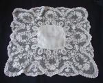 Comments: Nice Brussels bobbinlace applique on machine net. Work seems quite fine, design OK. I’m not wild about the looped ribbon bordering the center. But good handkerchiefs of this lace are not that common.