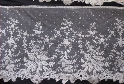 Comments: Good long, wide length of Brussels applique on machine net, both bobbin and needle motifs. Someone should rescue this piece before it gets swallowed up by the wedding dress industry.