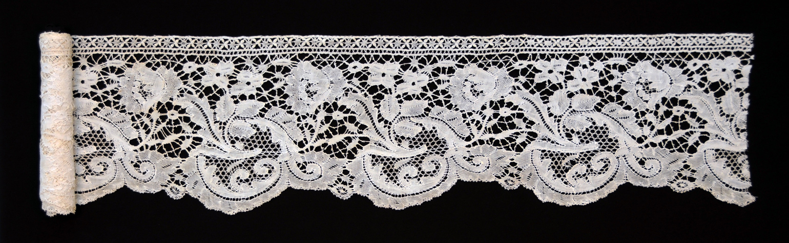 November’s lace is a tribute to my recent visit to Spain, where I learned a little about the vastly complex subject of guipure laces. The example shown is a 9″ wide Spanish Guipure, of which I saw many variations at the Arenys de Mar lace museum. Guipures like this were widely made throughout Europe and attribution can be very difficult. Some, like the Le Puy guipures are distinguished by their innovative grounds – in other cases there is little evidence to tell anything about origin. This piece of Spanish work is quite striking in appearance, and of good workmanship very appropriate to the style. It has a heavy florid design, a picoted irregular bride ground, and both half and whole stitch in the motifs. The elaborate header is not unusual in Spanish work. The simple star filling is typical of many Spanish laces, and can often be used to distinguish these from similar European techniques.