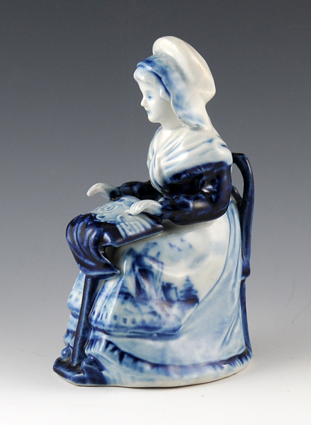 The first two figures are extremely beautiful – the glaze on the first one is so fine that it is a bit hard to photograph. Both these figures have the same number, 2391, carved on the back of the chair. In the two below, both have the number 2178 scratched faintly in the bottom of the base. They are quite similar, with openwork done on the back of the chairs. Note the windmills painted on the aprons of all the figures. None of these figures is inscribed with the ‘Delft Blauw’ mark from the officially sanctioned Royal Delft factory in the city of Delft. This basically means it’s very difficult to tell where they were made. Nevertheless, the workmanship is very high quality on all of them, and they reach good prices (~$100 – ~$500 depending on condition).