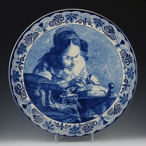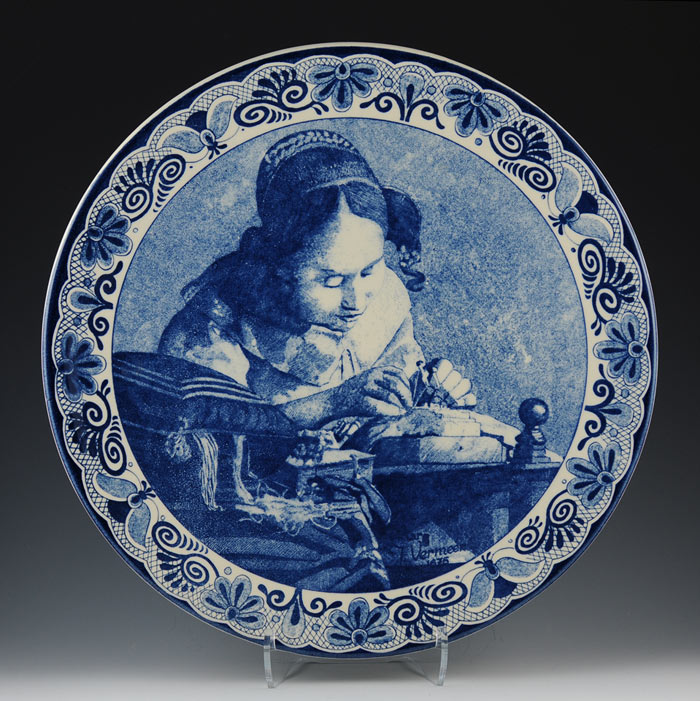 In searching on the term ‘lacemaker’ and ‘Delft’ on the internet, one is quickly overwhelmed by references to Vermeer’s Lacemaker, since he worked in Delft. One image that I found is a Vermeer lacemaker on a Delft platter, see Vermeer’s Lacemaker Charger on the Worthpoint site, which records auction prices. There are four photos of the plate, the last one with the Delft mark that the lacemakers in this post are lacking. This example is 13-1/2″ in diameter.