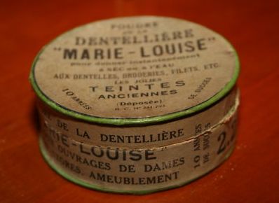 Comments: I have a box of this stuff in my collection, and even though the lid is on, the brownish powder gets all over everything. Remember hearing people say how lace can be colored by dipping it in tea? Someone finally decided to cash in by formulating a dye specifically for lace, marketed by Au Bonne Marché in Paris, 1930’s to 1940’s, maybe. You can dissolve it in water and soak the lace, or you can rub the powder in directly. Messy stuff, and who knows what actually is in it.