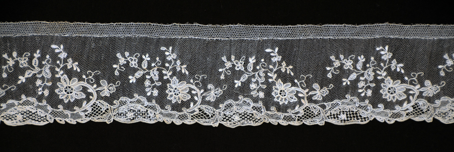 The lace shown is 3-1/2″ wide (including the heading), and is typical of the romantic designs found in the later 19th century. The ‘rempli’ (solid sections) is a rather open stitch in contrast to the denser work of earlier examples. This provided a little edge in speed of construction, and one can often find large, elaborate pieces from this period.