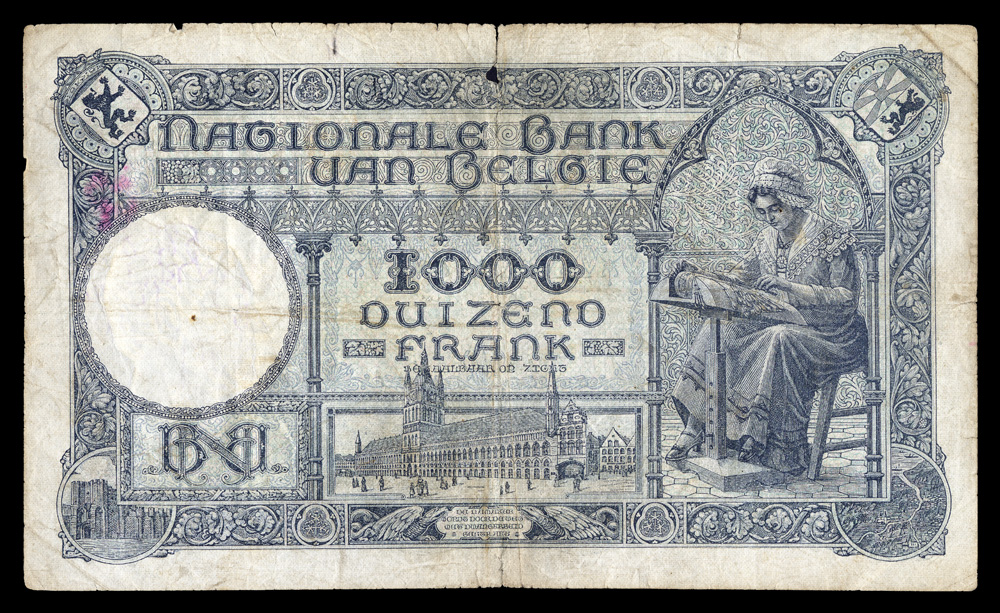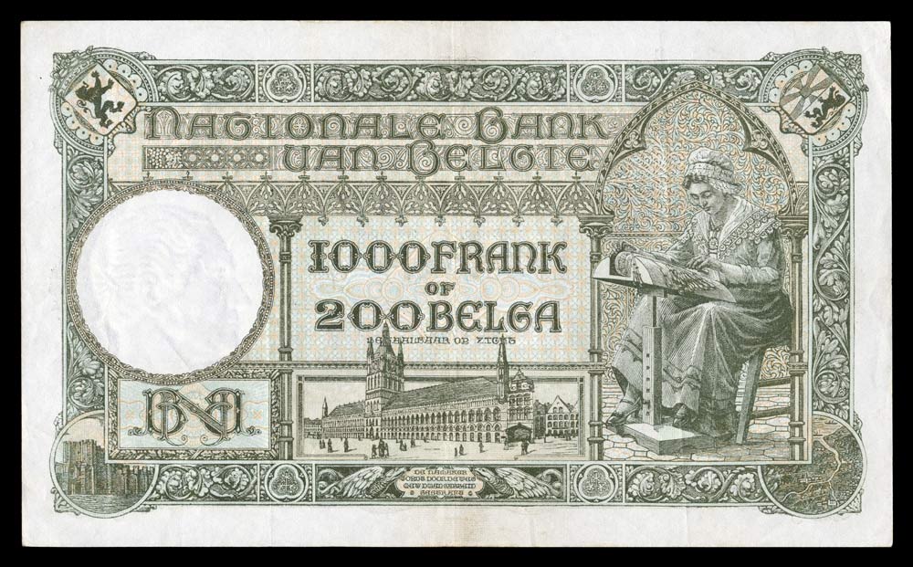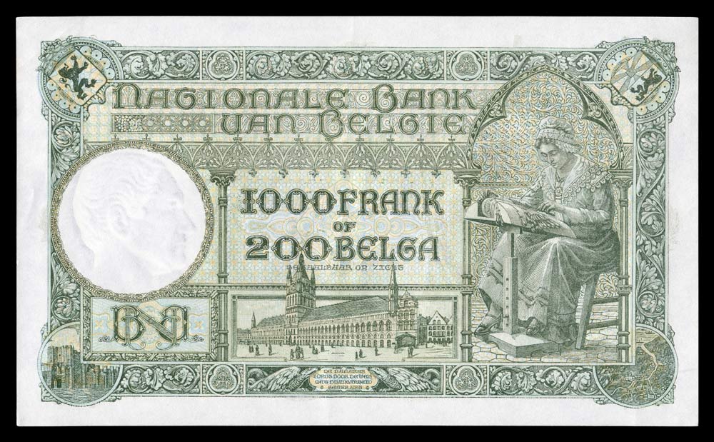 This banknote is of interest to lace collectors due to the wonderful engraving of a lacemaker at work on the reverse. The front shows a portrait of the Belgian King Albert I (1875-1934, reigned 1909-1934), and Queen Elisabeth (1876-1965), along with a watermark of the king’s profile. Even though King Albert died in a mountaineering accident in 1934, his portrait continued to be used until the end of WWII.
