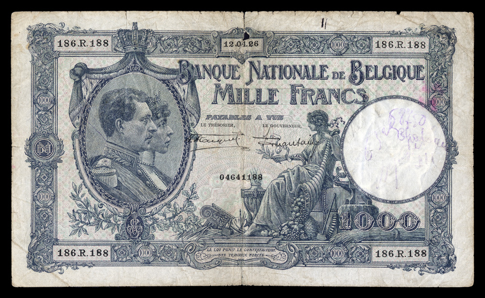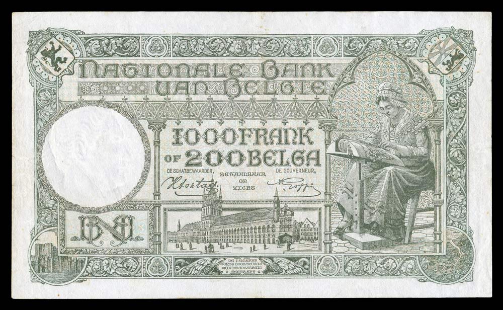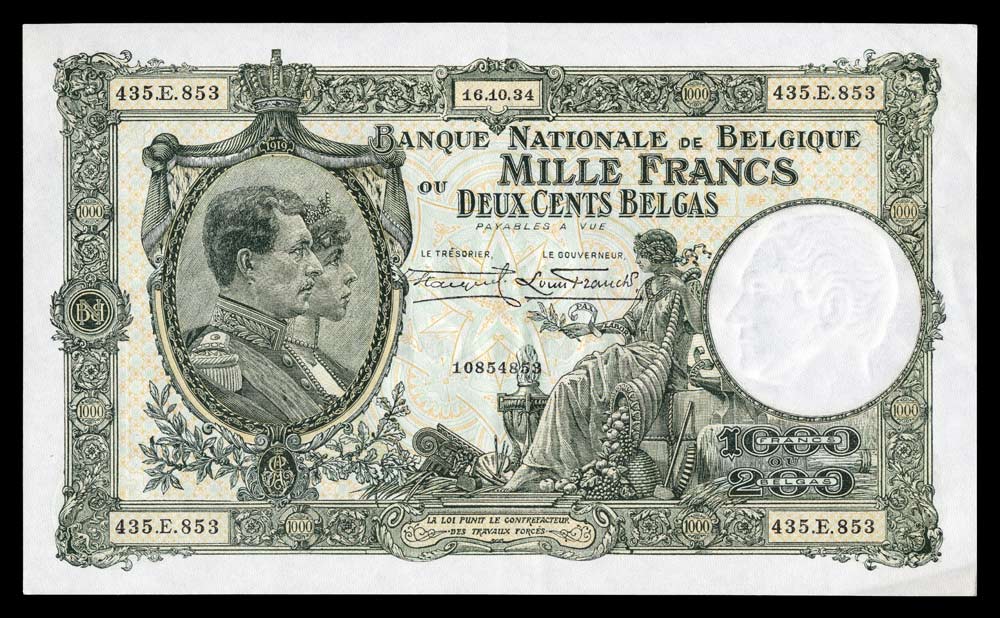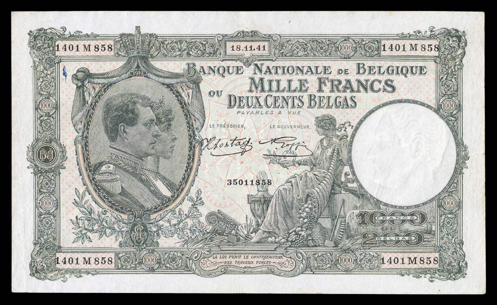The 1000 frank/200 belga note was issued yearly from 1927 to 1943, with the date engraved at the front top. Below are shown examples from 1934, 1939, 1941 and 1943. (Note the slight change in engraving in 1941.) The first example from 1926 is for 1000 francs, with a blue color and a little different background to the main engraving. This illustrates that the basic design was in use for the 1000 frank note a year before Belgium developed the belga in 1927. The first frank/belga notes also seem to have been backdated to 1926, although I have not been able to find an example.