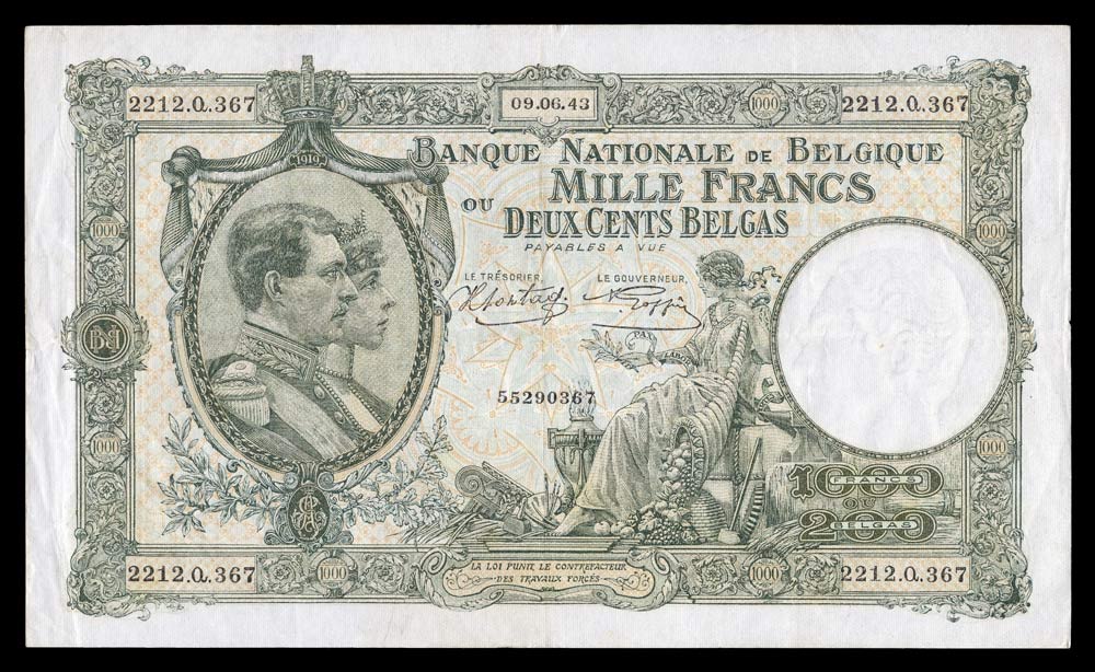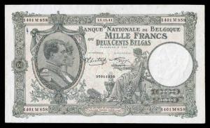 In 1935, the Belgian franc was devalued by 28% to 150.632 mg fine gold. The US had abandoned the gold standard in 1933, so the conversion based solely on gold values is no longer valid for this period. Following Belgium’s occupation by Germany in May, 1940, the franc was fixed at a value of 0.1 Reichsmark, reduced to 0.08 Reichsmark in July, 1940. This is where it gets confusing – the Reichsmark was valued at 40 cents in 1940 and had fallen to 5 cents in 1941. Getting values after this is quite difficult, in fact no one seems to want to commit to a value at all in period between 1941 and 1944. In 1944, the franc entered into the Bretton Woods system, with an initial exchange rate of 43.77 francs = 1 US dollar set on October 5. Following liberation in 1944, a new note printed in England replaced this one. Again, the new issue was backdated to 1943, so there are two different 1000Fr/200Belgas dated 1943.