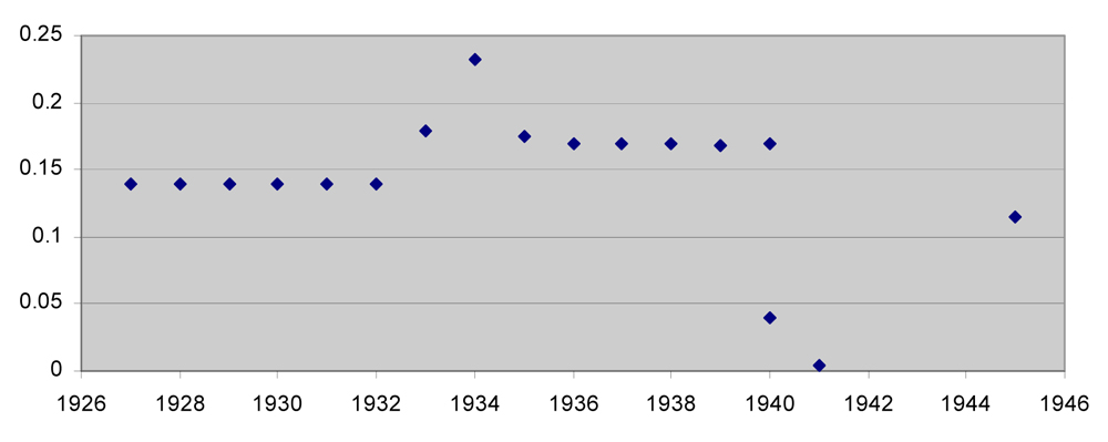 Below is a graph of belga values in dollars for this period, along with an estimate for what it would have been worth in 1945 if the belgia were still around. I also added two points for 1940/41. Values are taken from http://www.measuringworth.com/datasets/exchangeglobal/. I leave it to the reader to convert these numbers into today’s equivalent currencies.