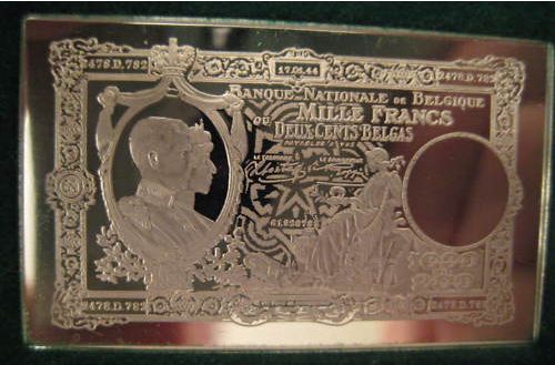 Franklin Mint copy of the 1000 frank 200 belga note – I don’t know if the lacemaker on the reverse is present. Etching on silver, 4.1 cm x 2.5 cm.