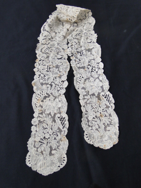Comments: These lappets are actually mid 18th c Belgian Point d’Angleterre. A pieced lace with droschel ground. The design is a bit messy. Some people would say that pushes it over to the English Devon laces, but I think it’s Belgian, more on the Brabant side. Good condition – the brown stains will come out with proper washing (I know a great resource for washing pieces like this). Pieces like this are always two lappets joined together, which is the reason that many of these pairs stayed together over the years. I think the length is a little short – tops may have been cut a bit. Hard to tell from the photos. Single lappets like this are more in the 22″ – 24″ range.
