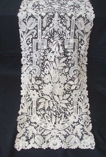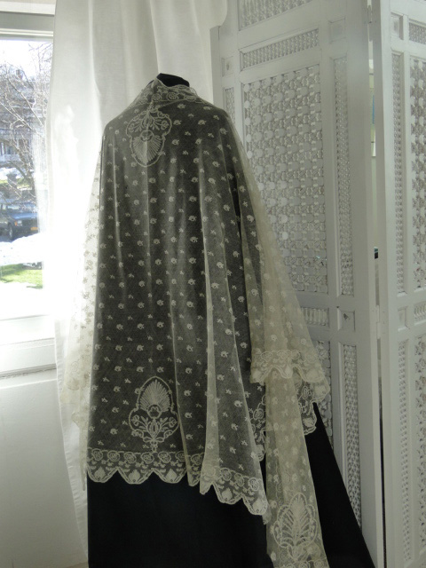 Comments: A good Duchesse bobbinlace shawl. Motifs are quite bold and well made. The bride ground is nicely used to set off the motifs. Condition looks very good.