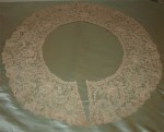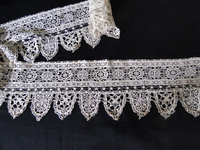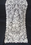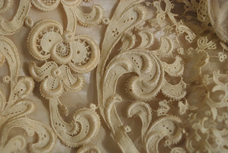 Comments: People go nuts over this kind of lace – it is entirely machine made, but also required considerable hand-finishing. It is basically a burnt-out embroidery process. One needs to be a little careful here – the name ‘punto cordello’ is often applied to this type of lace. Cordello was an imitation needlelace, using a hand-darned background with padded outlines attached. This is not what we are looking at in this piece.