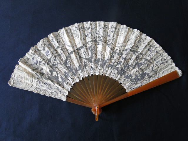 Comments: An interesting Belgian needlelace fan with a novel take on the raised rose petals. Excellent technique, with varied fillings. A beautiful piece – almost a bit too heavy for a fan leaf. But this is offset by the very simple sticks. No condition issues that I can see.