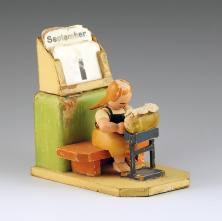 A third, even older figure is shown on the righthand side above. I think it dates about 1910, and has a calendar theme. It was in better shape when I first bought it, but now has a few areas flaking off, mainly in the hair.