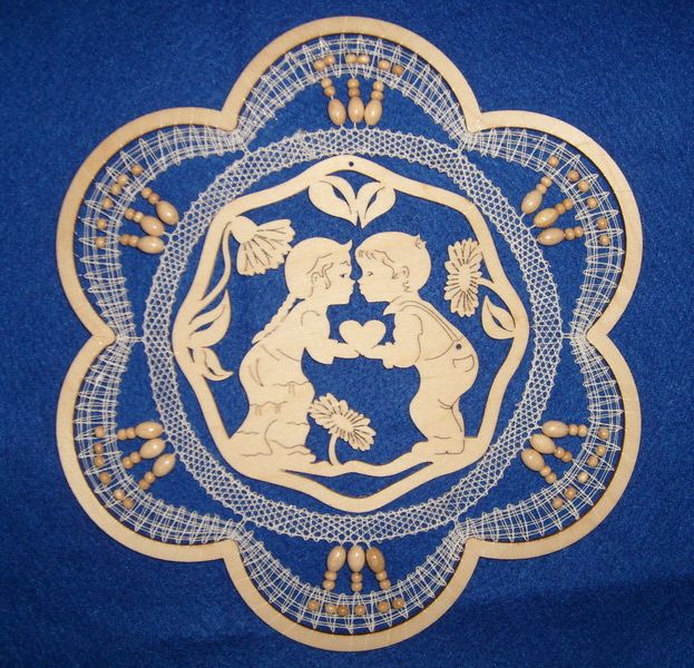 Here is an example Fensterbild lasercut wooden frame including bobbinlace. I like the little beads that look like bobbins (but I’m not sure how long I’ll be able to hold out using this as an example with those cute kissing children…):