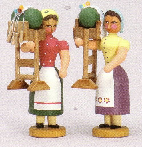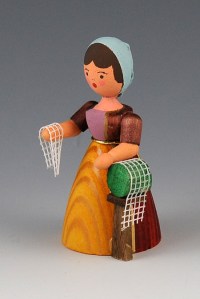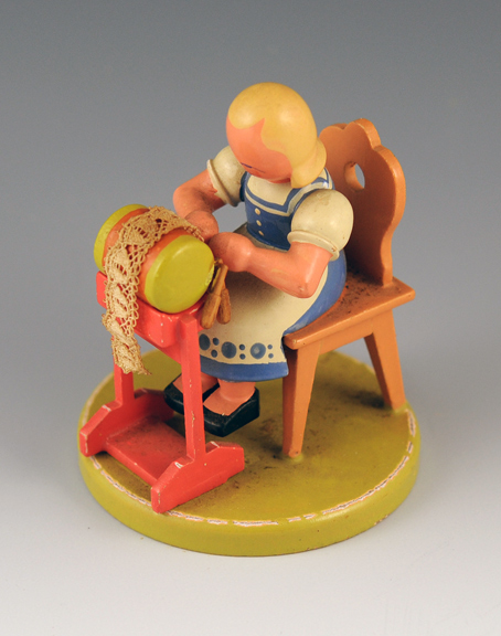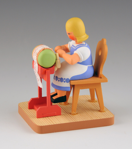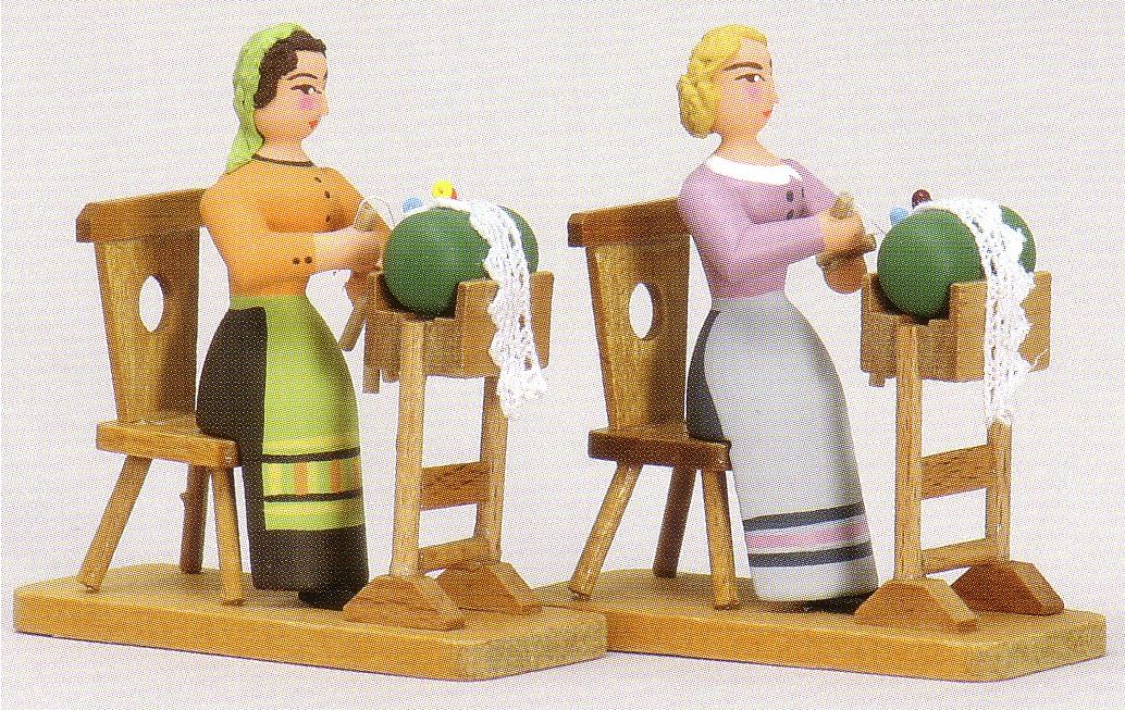 One of the oldest and most famous of the miniature wooden figure makers is the Werkstatt Leichsenring http://www.blumendrechsler.de/home.htm. Their current Klöppelfrau and Klöppelmädchen designs are shown below. They are beautifully made.