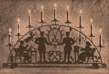 Schwibbögen are arched candle holders with cutout images, originally made from a single sheet of forged iron which could then be painted. The first one was made in 1740 in Johanngeorgenstadt (see http://tinyurl.com/4r9wgw8 for an example based on the earliest design). The arched shape represents the view a miner would see on leaving a mine tunnel, and the lights are a reminder of darkness he has just left. The version with the lacemaker, a woodcarver, two miners, two crossed swords, two hammers, a Christmas tree, and an angel is the most famous. The graphic designer Paula Jordan (1896-1986, http://tinyurl.com/4ha8b2c) was commissioned to create the work in 1937 for the important Erzgebirge folk-art exhibiton “Feierohmd-Schau” held in Schwarzenberg (1937/38). The design became the symbol of the exhibtion.