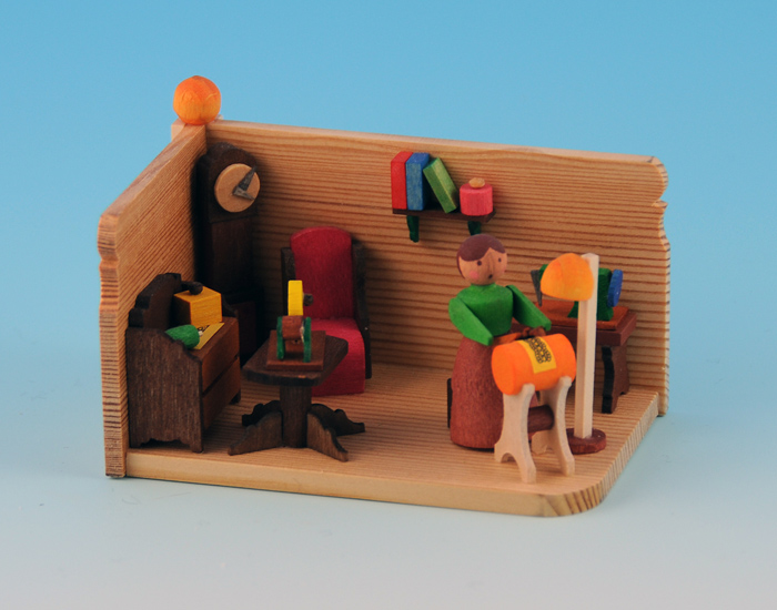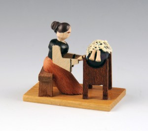 One of my favorites, a complete lacemaker’s ‘studio’. It includes the seated lacemaker and her klöppelstand, a lamp, a sewing machine on a table, a bobbinwinder on a table, a little dresser, larger chair, tallcase clock, and books on a bookshelf. By Graupner Holzminiaturen; the piece is 2″ tall. http://www.holzminiaturen.de/