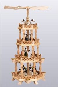 The ‘Christmas Pyramid’ may be a predecessor of the modern Christmas tree. Note the candleholders on this example – the heat from the candles will turn the fan on top, causing the various layers to rotate. This one appears to have a klöppelfrau on the second level at the back (http://tinyurl.com/4hrxud5). A smaller, more modern interpretation can be seen at http://tinyurl.com/4w8alz3.