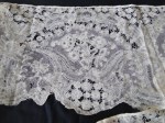 Comments: This type of heavy design, wide pieced lace, that looks a little rushed, is often labeled Brabant. That is basically taken to mean a lace made outside the refined Brussels or other major metropolitan areas. It is often found in wide (here 11-1/2″), long lengths. I’m not aware of any study that really pins down the origin of this lace – it could have been made in the Brugges area, or it could even be an English Devon product. This particular one has some damage, but is a very good example of the genra.