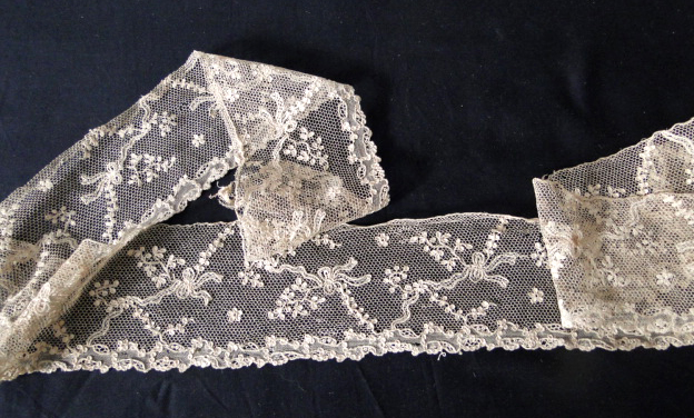 Comments: Not very long (28″ x 2.5″), not in the greatest condition, but I like this piece. Nice design of bows, using the brides boucle ground and regular Alençon reseau as a filling. This stiffer edged lace often goes under the name of ‘Herren Alençon’, indicating it’s use as cuff material on men’s shirts. But it could be used as an edging anywhere. This one has a little more elaborate design than is usually found. Impossible to say if it was made in Alençon or Agentan – in the later 18th century both towns used many of the same stitches.
