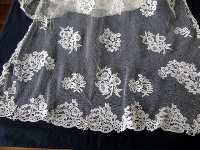 Comments: 115″ x 30″, a nice Honiton applique shawl on machine net. At least I think it’s Honiton, Belgium is usually a little finer on the motifs. A few small holes but overall good condition. I remember giving a friend a veil like this for her wedding – someone stepped on it at the reception and tore a big hole. The marriage didn’t last either.