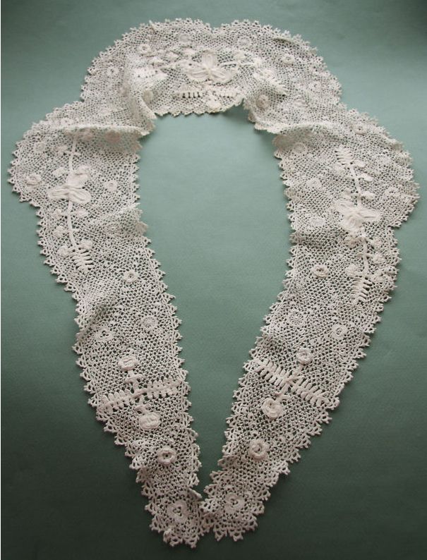 Comments: Excellent Irish Crochet shawl collar with a design sometimes known today as ‘Rose of Sharon’. Note the finely worked dense crochet motifs against the regular ground.