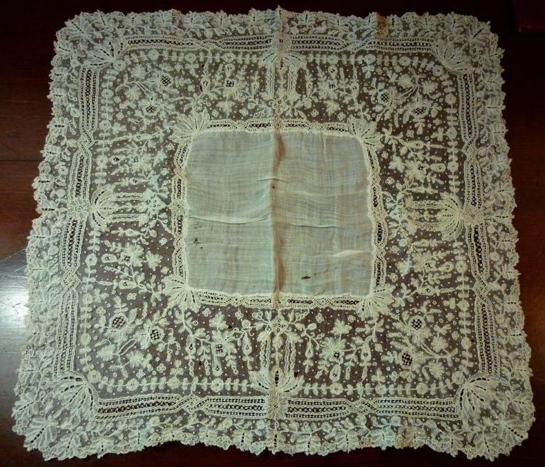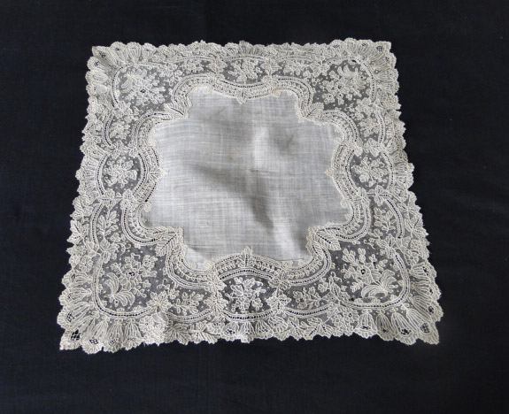Comments: Good Belgian Needlelace (point de gaze) handkerchief. No raised work, minimal fillings, and the design is fairly bland. But it’s a nice overall presentation. Few very small holes, but generally OK.