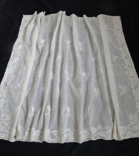 Comments: I should do more with Dresden pulled thread embroidery on this site, since it was such an important competitor to lace in the 18th century (Heather Toomer has a fairly recent book out on the subject). This apron is an unusually big piece, few condition issues in the cloth, but you can see how the pulled thread work mimics lace patterns.