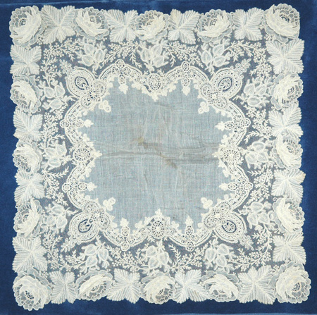 Comments: Fine handkerchief, point d’angleterre combined bobbinlace with point de gaze ground, this one also has needlelace raised petal roses (unusual). Great needlelace fillings. Staining to the handkerchief linen, but lace seems to be OK.