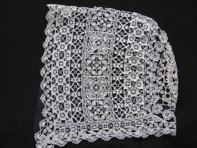 Comments: Lovely Irish crochet fallcap, good tight workmanship. Looks in excellent condition. It’s hard to tell, but this piece does look very white – which might be a sign of original condition, or maybe it was bleached… I can’t tell. I do like it very much.