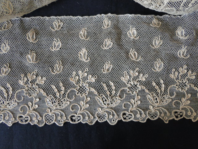 Comments: This is, of course, not Honiton, but the rarer and very elegant Valenciennes de Gand. A beautiful piece, looks in excellent condition. Val de Gand is actually a pieced lace – many of the motifs were made at the same time and combined into various patterns joined by an unusual square bobbin mesh with only 3 threads on each plait. This helped reduce the manufacturing time.