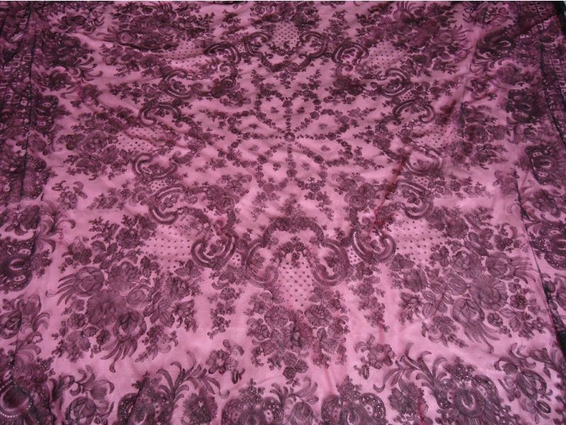 Comments: An impressive looking large square Chantilly shawl. Wish there were a photo of the whole thing, I’m a bit confused about the right and left side edges toward the top of the photo. Expected seam separation is present, some of which is repaired with a simple overcast stitch. A few other holes. A similar Chantilly square shawl was sold on Ebay in May 2009, similar price range. Origin of these pieces is unknown. The actual work has large areas of half stitch, appropriate to the scale. No ombre shading.