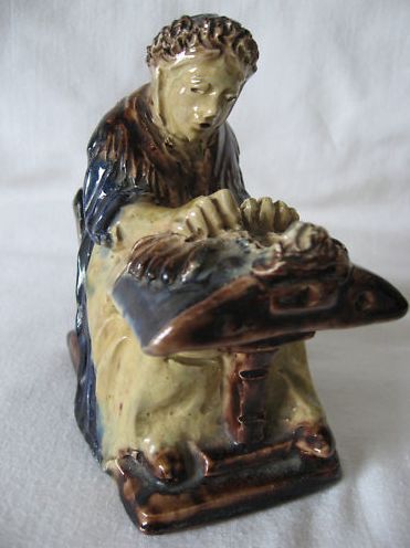 Comments: This is the smallest size Van de Voorde Flemish Pottery lacemaker. Condition looks good from the photos, but I’m not sure what the line “stoel 1 sport !!!” means. Perhaps a flaw in the chair?