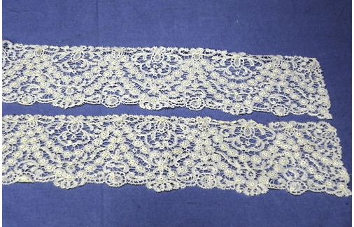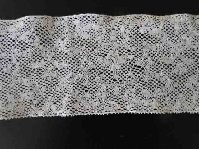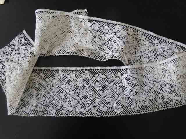 Comments: Early 18th century; this kind of lace is very hard to attribute. Note the almost ‘5-hole’ ground, sometimes seen in Antwerp laces, and used with finer thread, in mid 18th c Valenciennes. You also see it in early brussels laces, with the same rather scattered, disconnected motifs. Add some small tallies, switch to a finer thread and a snowflake ground and you have what today is called ‘Binche’. Although we really don’t know much about the original products of Binche vs Valenciennes. This is such a difficult lace to place that many authors avoid it altogether, or just call it some kind of Brussels or Flemish lace. Someone should really try to nail down a history.