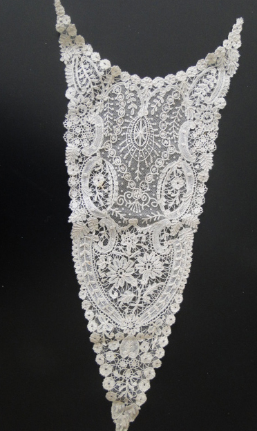 Comments: A better than average Belgian lace front. This would have come with cuffs and a collar piece, but it stands well by itself. Nice fine bobbin motifs, and the needlelace is extensive with interesting fillings. A few spots, but overall good condition.