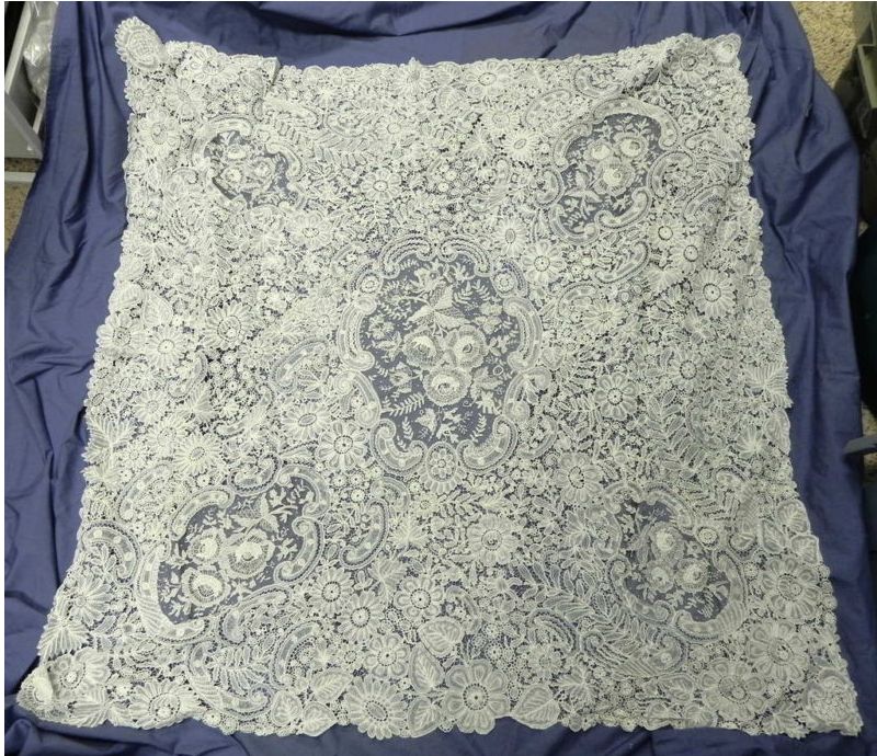Comments: Sellers are really digging themselves into a hole with the description of this one. Let’s just call it Brussels Duchesse. A real wild flower garden of a piece, looks very tossed together with some symmetry elements, but not entirely consistent throughout. Looks somewhat deliberate, but a puzzle. A little damage to some of the needlelace, but overall in good condition.