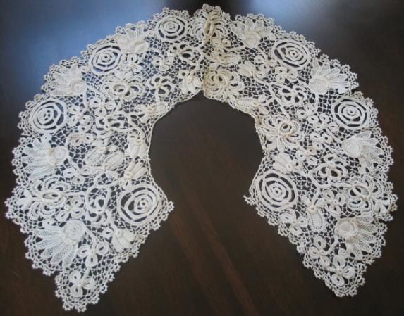 Comments: Good Irish Crochet collar with single knot on the brides. Design is a bit confused and not entirely symmetric. But I like some of the motifs with their raised elements. Condition looks good, little loose piece near the right endpoint of the inner collar edge. Nothing serious.