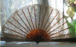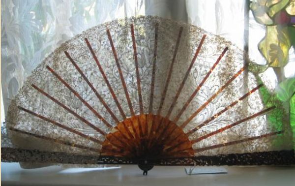 Comments: Large Duchesse fan with a point de gaze needlelace inserts (Duchesse de Bruxelles is one early manufacturer’s name for this kind of lace). Seems to have an interesting tulip design in the needlelace – the bobbinlace is standard Duchesse. Having a hard time seeing the whole design of the lace from the photos. Lace appears in good condition. Nicely carved fan sticks, one tiny broken piece.