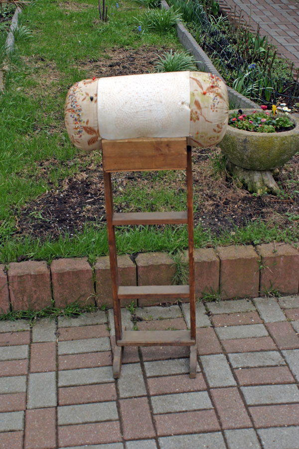 Comments: Interesting klöppelstand, pillow, and 33 hooded bobbins. Stand is well made, looks delicate, but seems pretty sturdy. No frills on this one, just hold the pillow and support the feet. Seller says it dates from ~1930.
