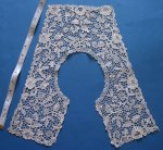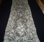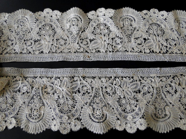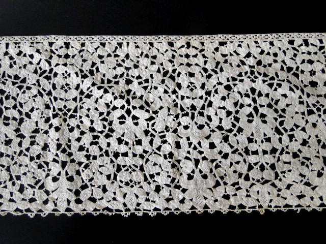 Comments: Good solid length of Duchesse de Bruxelles. Work on the bobbinlace is very nice; dense with well defined raised work. I like the ‘fan’ effect in the scallops. Needlelace is a bit plain. Very good length, has a few brown spots, but no damage I can see.